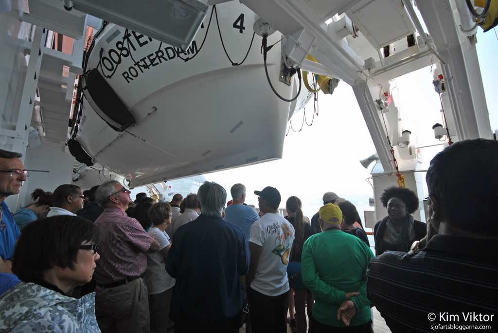 Den obligatoriska säkerhetsövning som man måste ha innan avresa. En aning kaos var det när de började räkna upp hyttnumren och man skulle svara om man var där. Kommer verkligen alla ihåg sina hyttnummer bara en timme efter att de har gått ombord? Tur att det inte hände något allvarligt, 2000 man på promenaddäck är rätt så trångt. En stackars grupp hade visst ingen livbåt heller, då den var på reparation i Juneau, så de skulle få ha knökat in sig i någon av de andra livbåtarna om de hade hänt något.