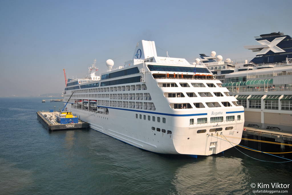 Medan vi hade varit inne i terminalen hade Oceanias Regatta lagt till framför oss.
