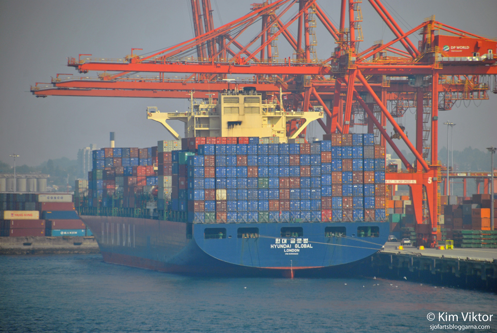 Containerfartyg, något större än de vi brukar få in till Stockholm.