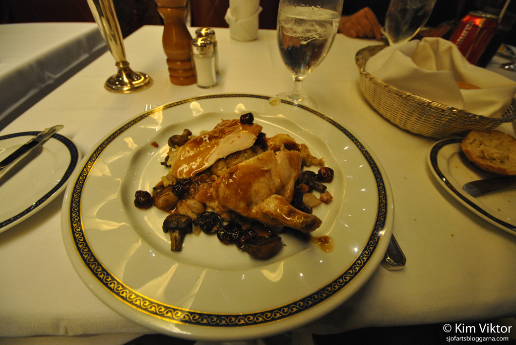 Några timmar senare var det dags för den första middagen ombord. Det blev först en räkcocktail, sen en god kyckling med risotto och efterrätten glömde jag ta bild på, så jag har ingen aning.