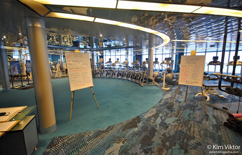 Vi fortsätter med inredningsbilderna, denna gång blir det långt ifrån lika många som sist. Här på bilden syns gymmet på däck 9. Självklart ska gymmet ha det bästa utsikten på hela båten! Jag använde aldrig gymmet, joggade runt på promenaddäcket istället.