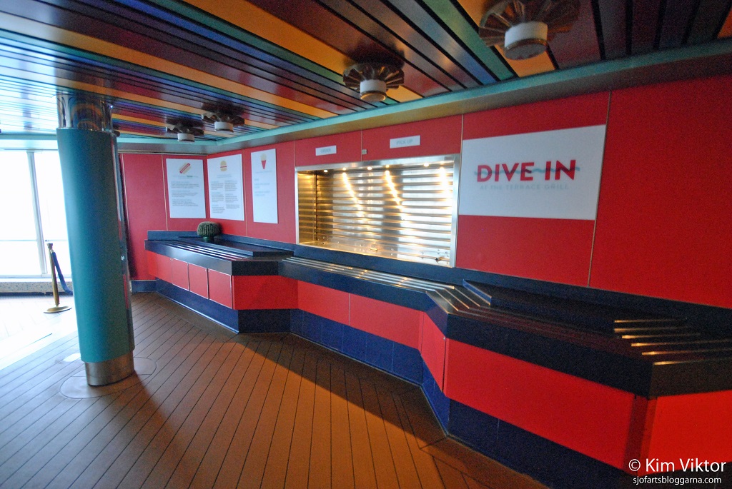 I ena hörnan av pooldäck ligger Drive in grillen, där man serverade lättare måltider som hamburgare och tacos.