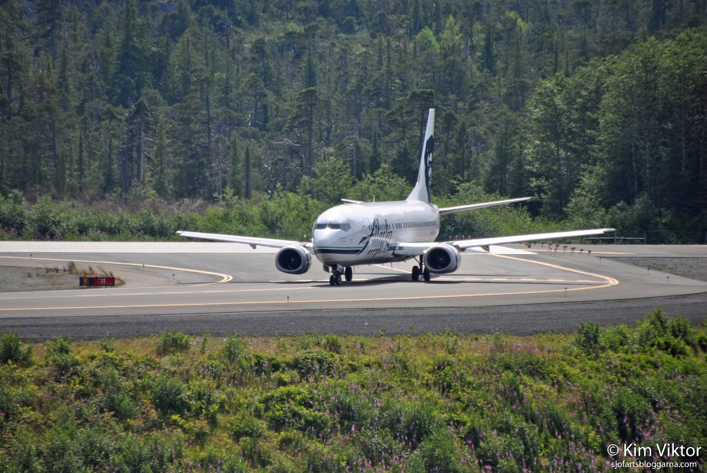Ett av Alaska Airlines plan landar på Ketchikans flygplats.