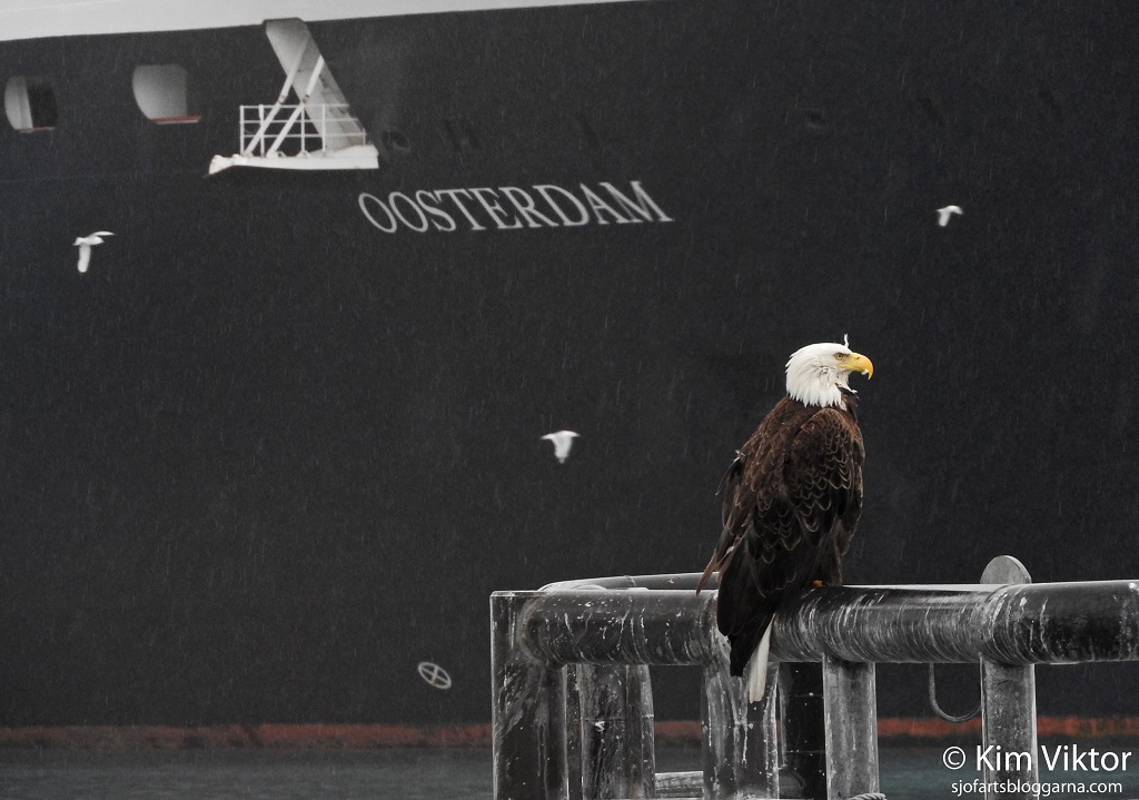 Vi har lämnat småbåtshamnen och havsörnen sitter vackert framför Oosterdam.