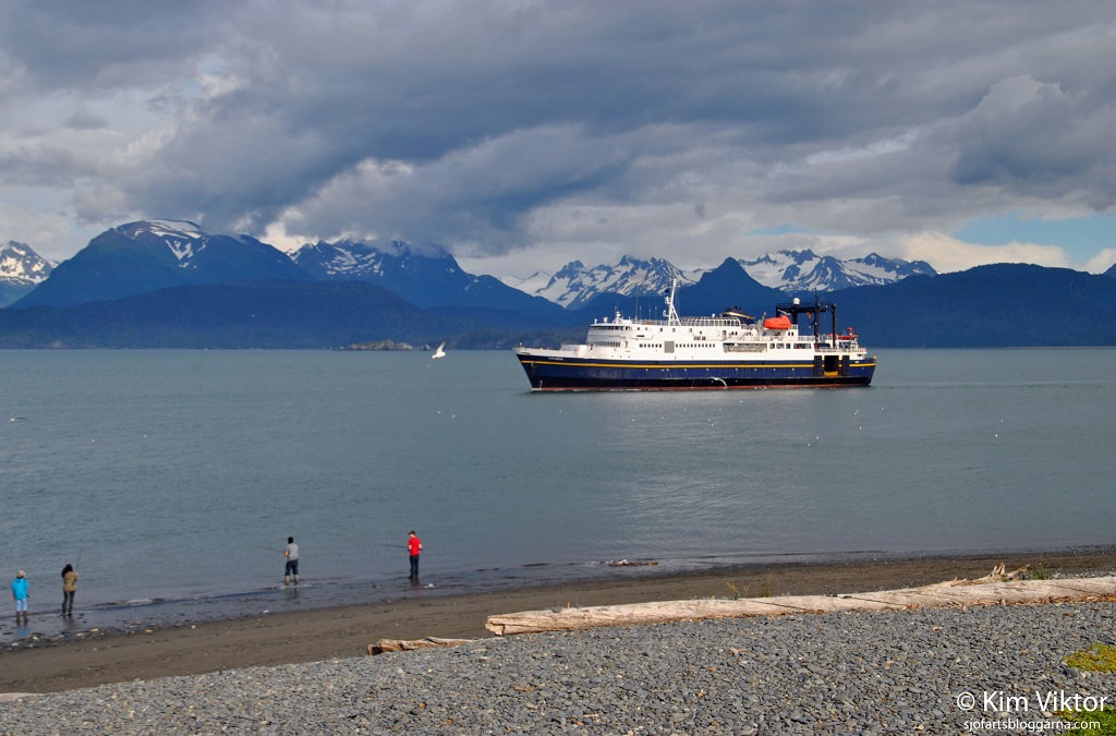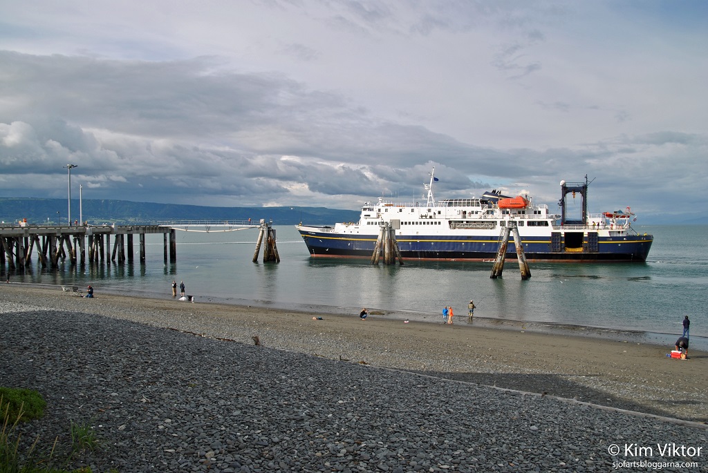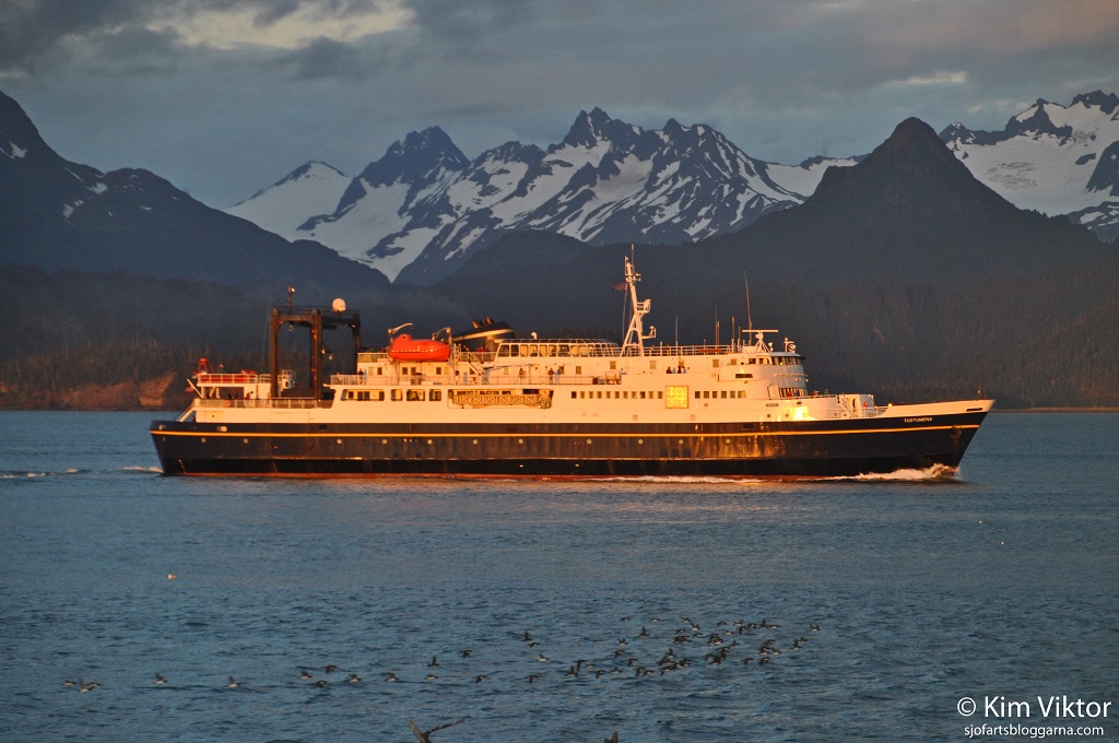 När vi satt och åt middag på hotellets restaurang kom plötsligt färjan Tustumena föri. Tustumena är byggd 1969 och går i trafik till öar längst väster ut i Alaska. Resan ut till Dutch Harbour och tillbaka till Homer tar en vecka.
