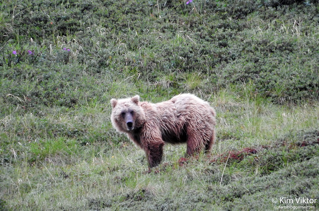 Busschauffören stannade när något djur siktades. Här är en av tre brunbjörnar vi såg under dagen. Utöver björn såg vi mest vildrenar. Det var en trevlig dagsutflykt som bara kostade 35 dollar per person. Det hade väl varit ännu trevligare om vädret hade varit lite bättre.