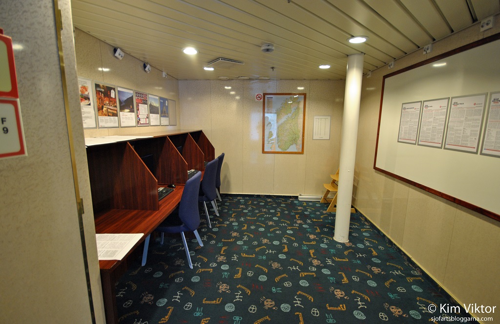 Biblioteket, på de äldre 90-tals fartygen (Nordlys, Richard With och Kong Harald) finns här ett fitnessrum, något som Polarlys helt saknar.
