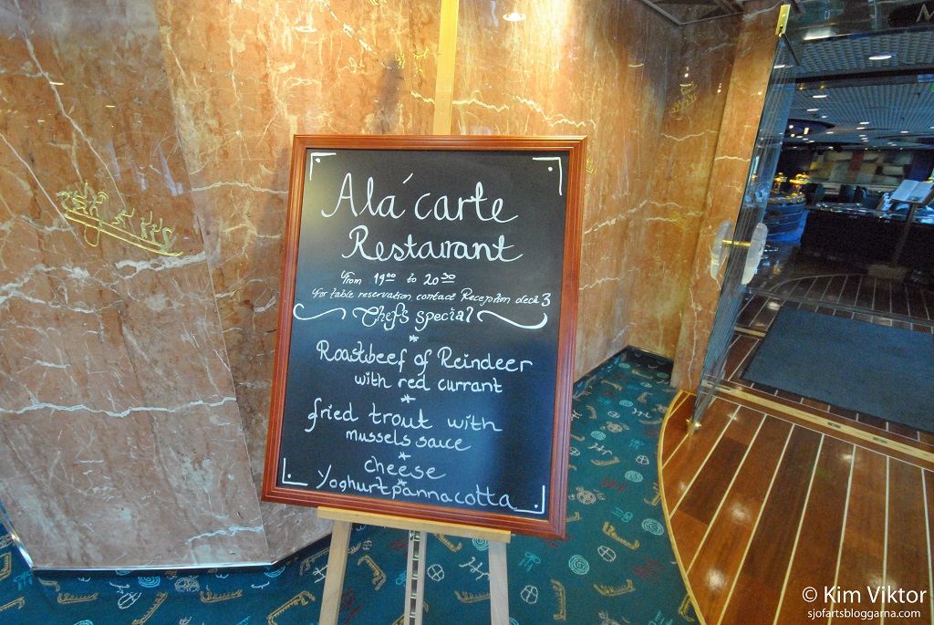 Den gamla Club bar Midnattsol är sedan några månader tillbaka a la carte restaurang. Om man vill äta här får man betala extra (160 NOK för två rätter) utöver helpensionen, om man inte har någon mat inkluderad i biljetten kan man äta här från 395 NOK. Kul med ett alternativ till restaurangen ombord, går väl samma trend som kryssningsfartygen med specialrestauranger.