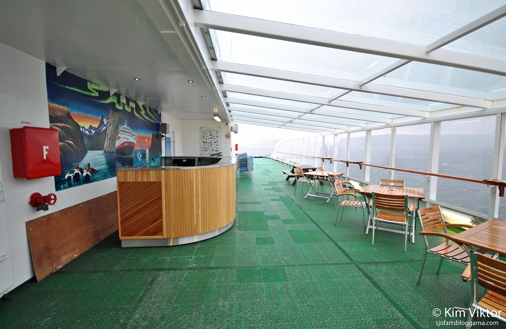 Vid avgång kom solen fram för först gången under denna resa. Här ute på promenaddäcket på däck 5 tillbringade jag mest tid under resan.