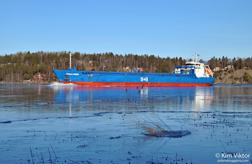 Bulkfartyget Paula Vindö lämnade Hässelbyverket i morse och bröt sin väg genom nyisen på Mälaren. Detta lilla bulkfartyg byggd 2013 flaggad i Liberia hade idag destination Liepaja i Lettland. Tyvärr ser det ut att bli varmare i veckan, så denna isläggning får betraktas som tillfällig.