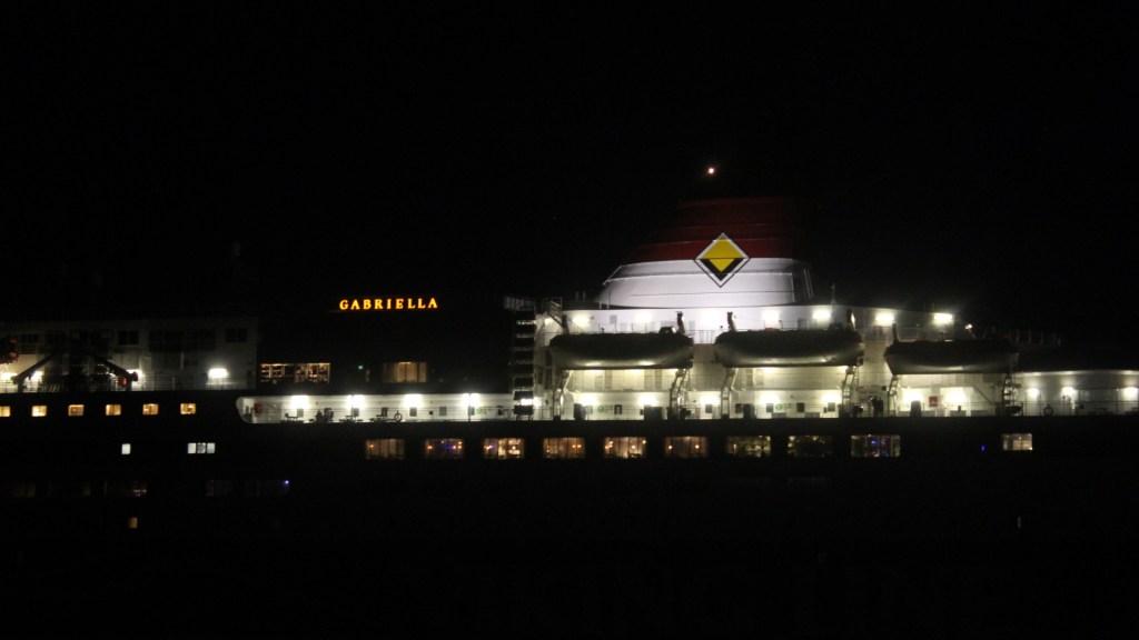 Baltic Queen som avslöjar sig lite genom den röda lamporna bakom bryggan 🙂