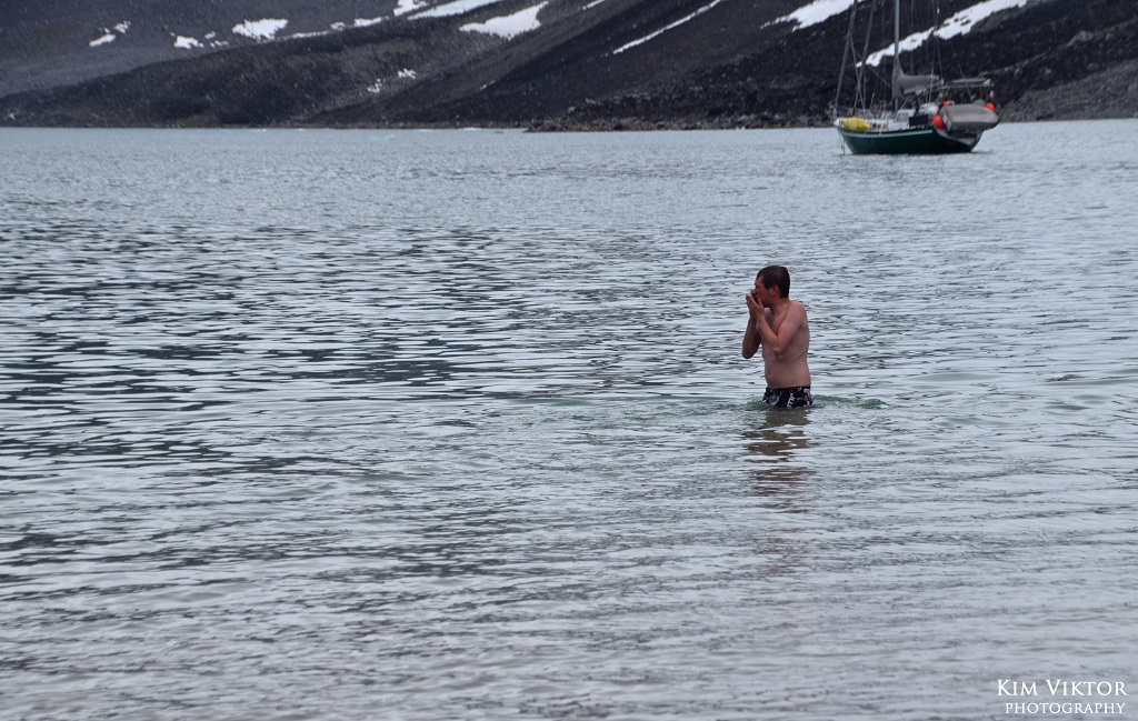 Vissa svenskar (även tre tyskar och en fransyska) trotsade kylan och tog ett dopp i det 3 gradiga vattnet. Jag kände varken fötter eller huvud när jag kom upp.
