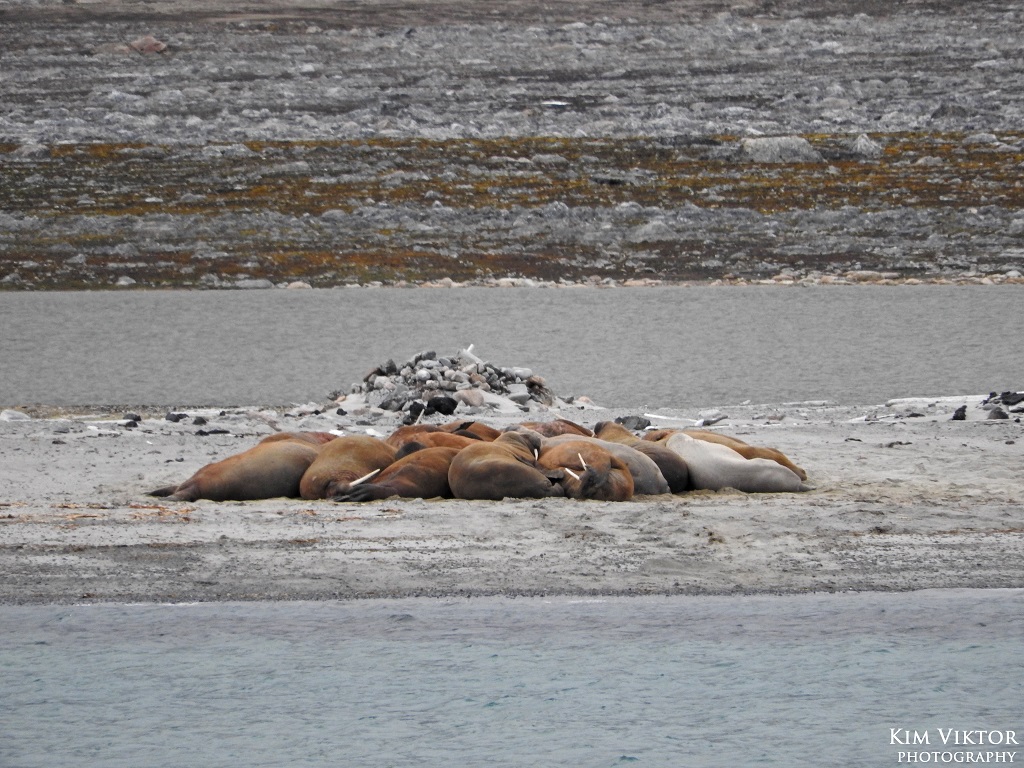 Vid Amsterdamøya fick vi syn på våra första valrossar. Dessa mäktiga djur, där hanarna väger runt ett ton! En imponerande vikt när man främst lever på musslor.