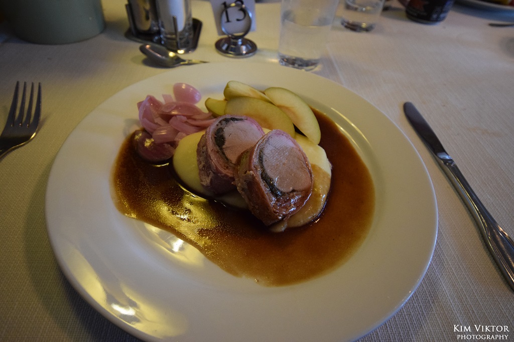 Vår första trerättersmiddag bestod av kallrökt lax till förrätt, baconinlindad fläsk Loin till huvudrätt och avslutningsvis en vaniljpannacotta. Mycket gott rakt igenom!