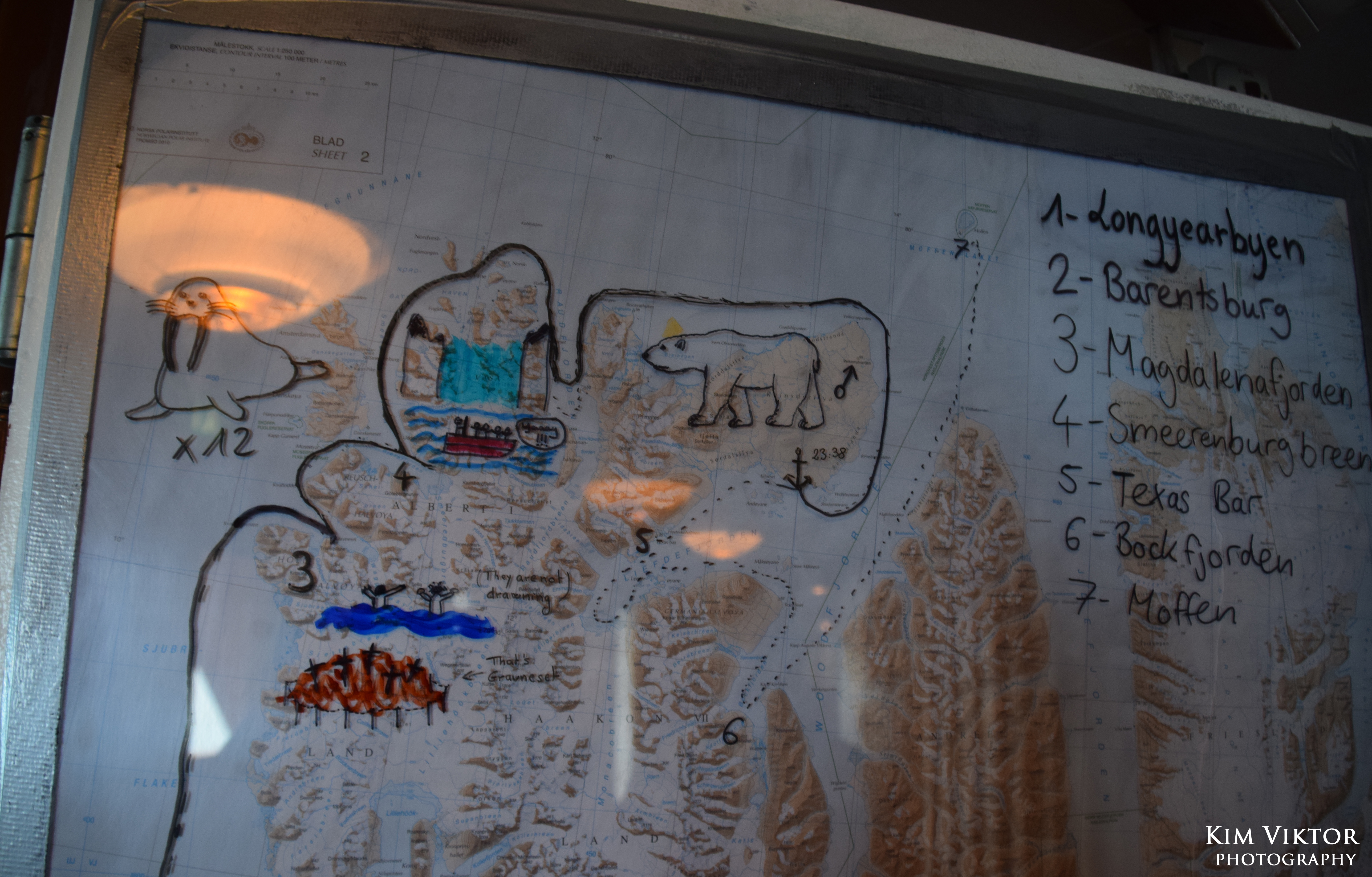 Vår franska guide var en fena på rita och gjorde fina illustrationer över vad vi hade observerat. Om jag hade ritat hade det nog varit oklart om det var en säl eller en isbjörn som hade observerats. 😉