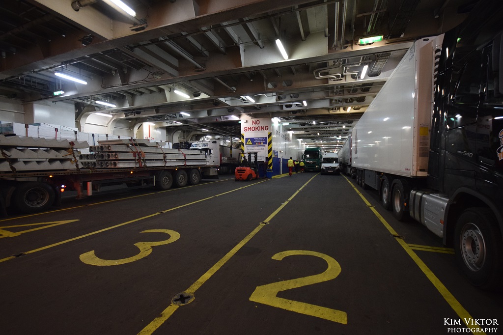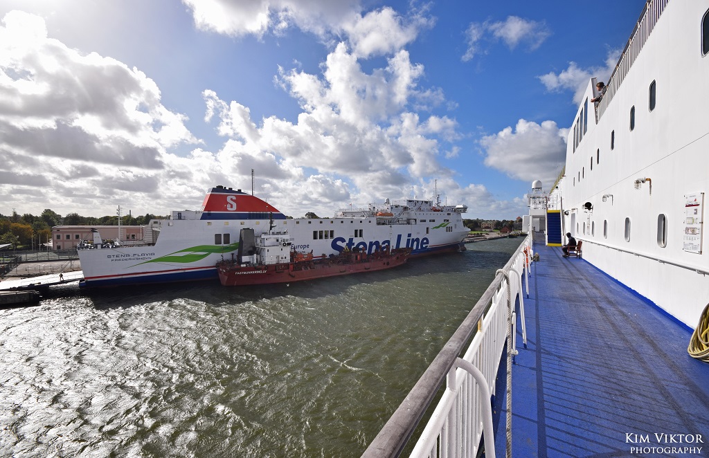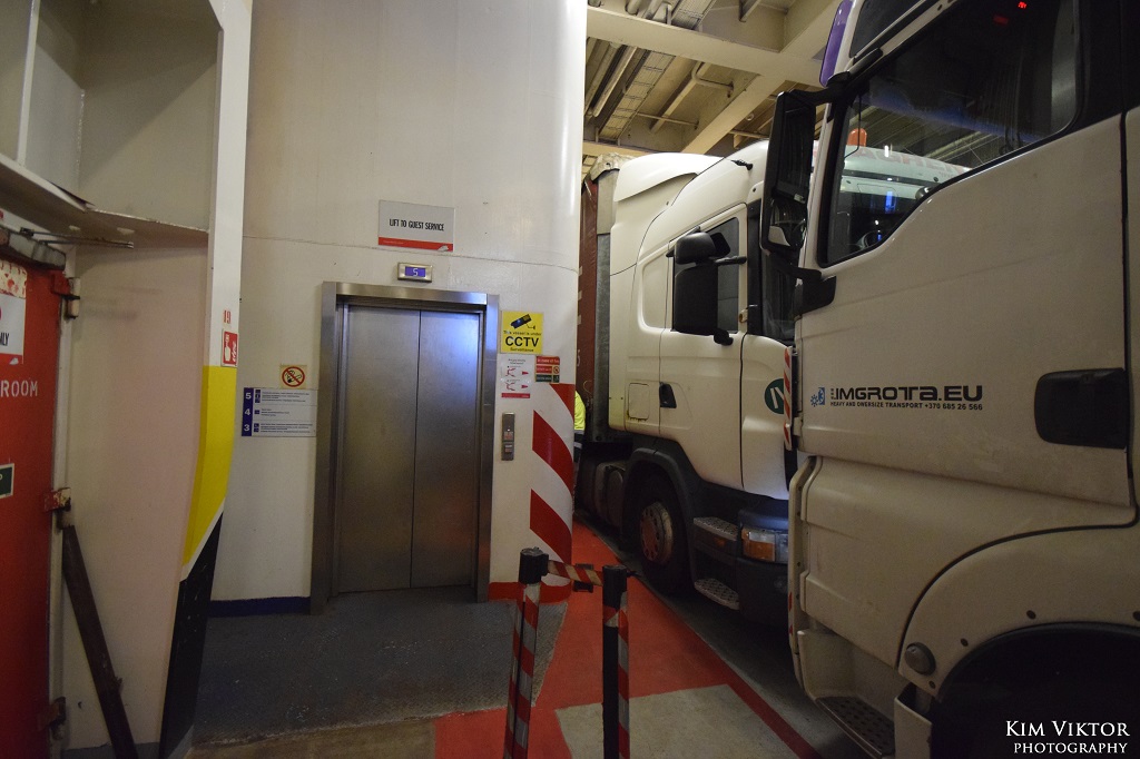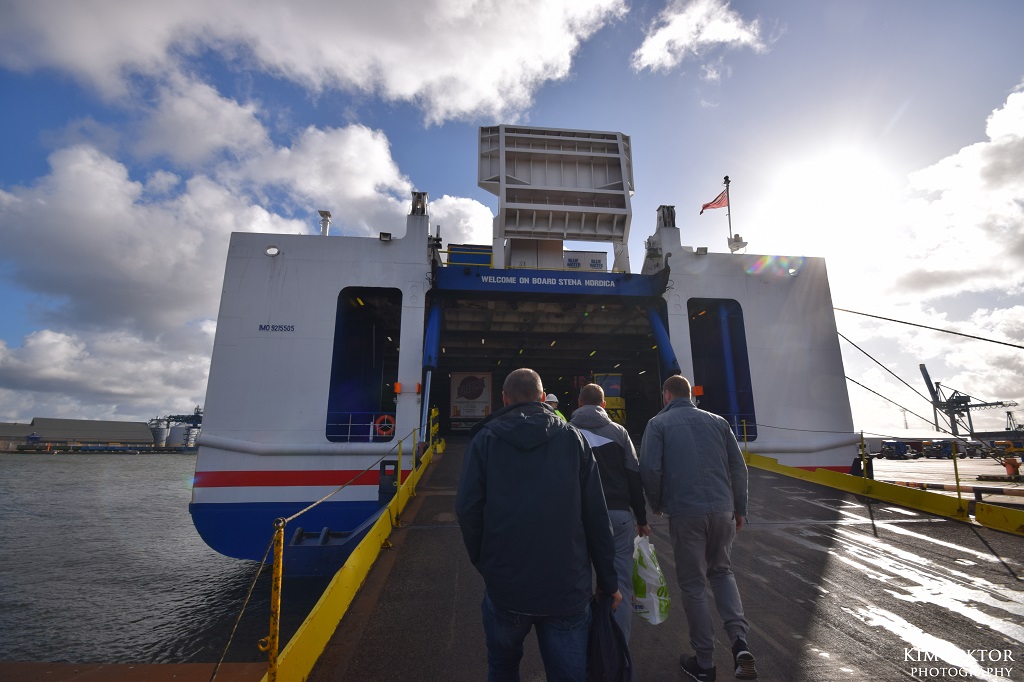 Som tur var behövde vi bara vänta 15 minuter innan vi släpptes ombord. Person från terminalen följde med oss en bit, men lämnade oss när vi gick ombord på Stena Flavia tillsammans med backande långtradare.