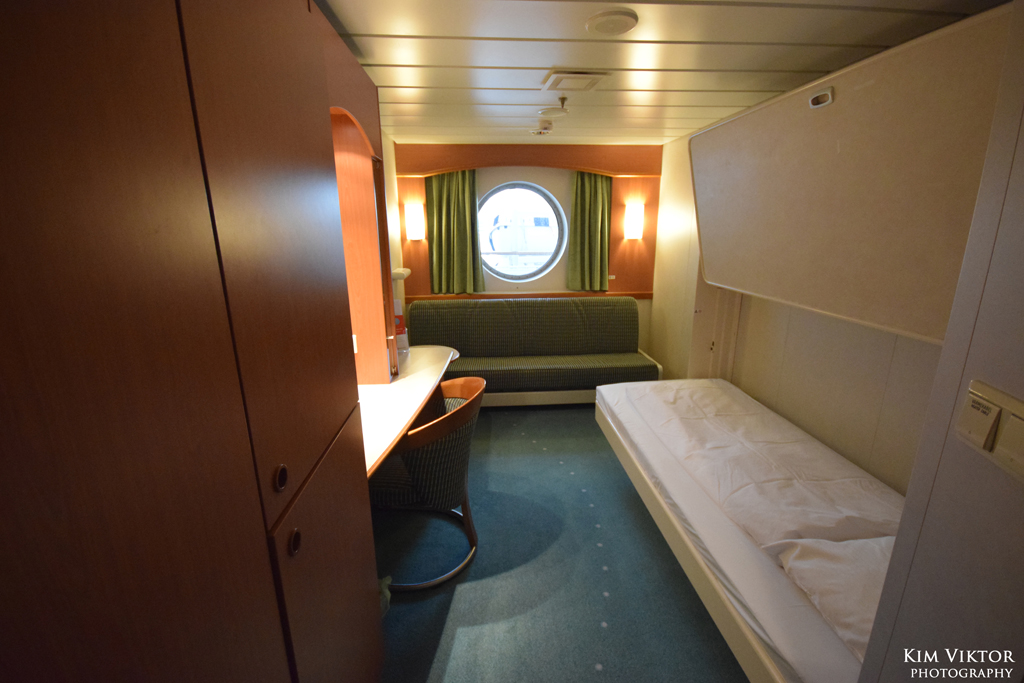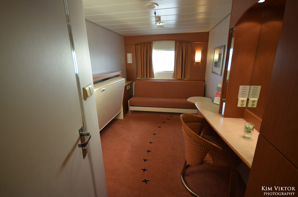 Vi hade en trebäddshytt med begränsad utsikt på däck 6. Bra med utrymmen i hytten, skulle nog kunna duga även för en hel 11-nätterskryssning.
