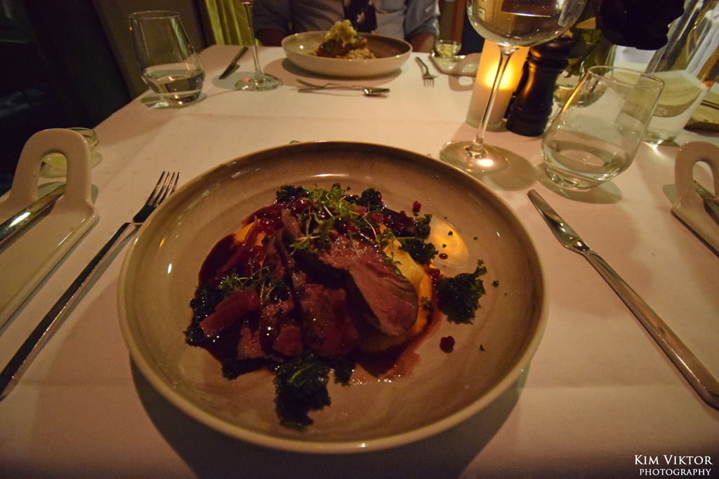 Denna middag var nog den bästa jag någonsin hade haft ombord på ett fartyg, med rökt and till förrätt, denna underbara renfilé till varmrätt och hjortron på tre sätt till dessert.