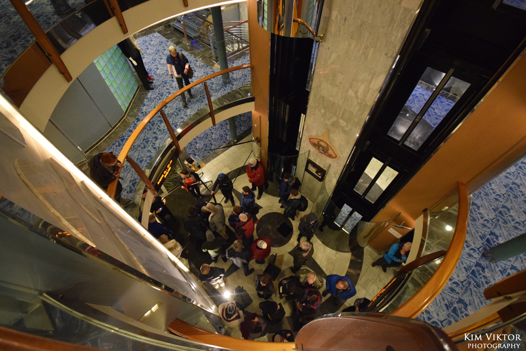 Efter middagen var det dags för ilandstigning i Svolvaer. Förväntansfulla passagerare väntade vid landgången.