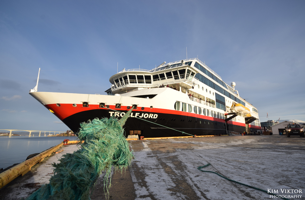 Trollfjord vid kaj redo att välkomna oss ombord.