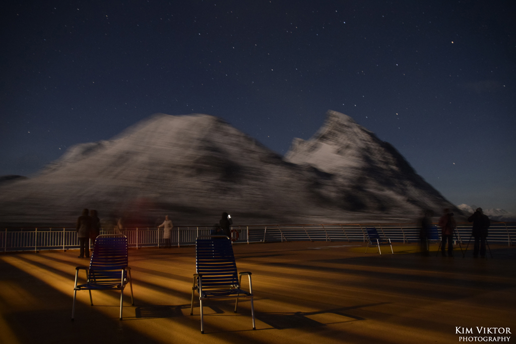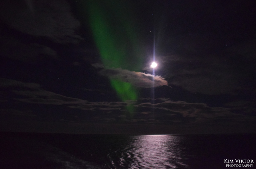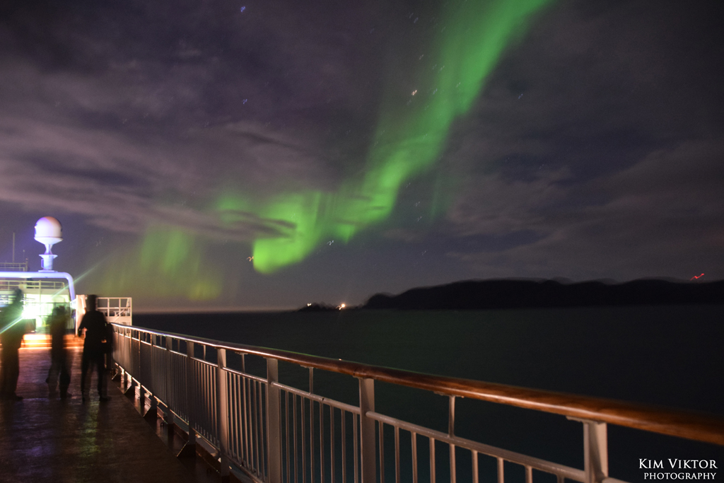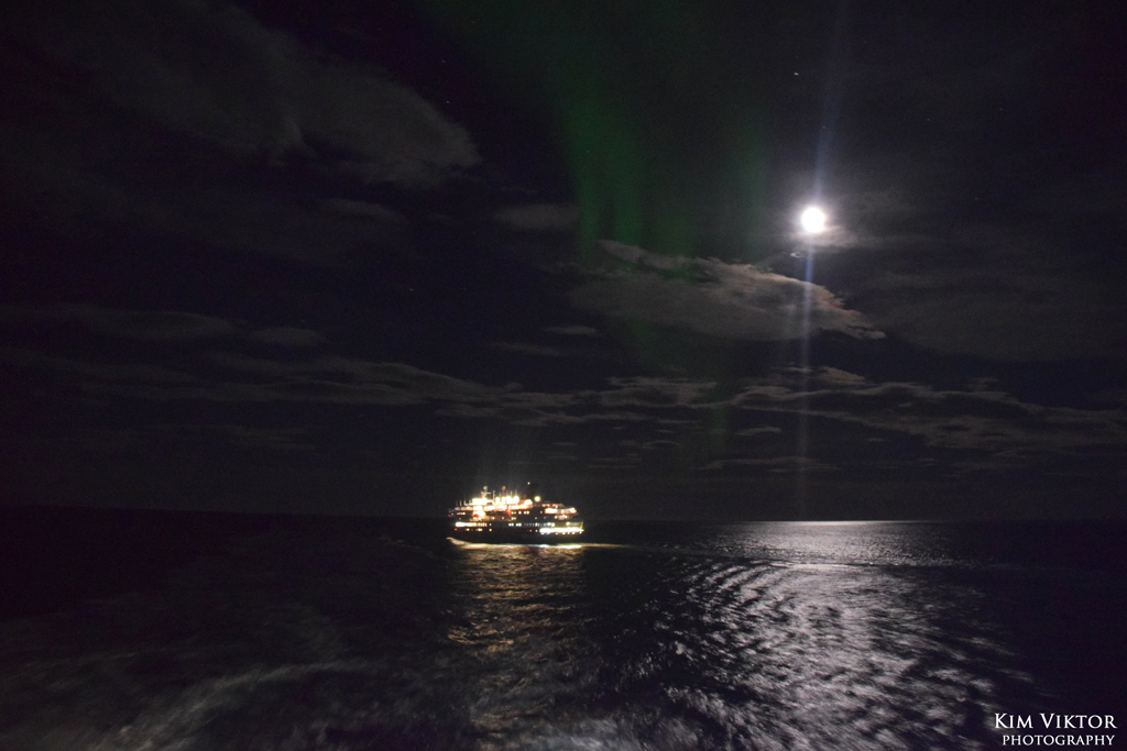 Strax efter avgång från Tromsö var vi ute på däck och spanade norrsken, när det snabbt susade förbi et grönt sken, hann knappt få upp kameran på stativet och än mindre ställa in inställningarna i kameran, därför inte det bästa resultatet. Men jag skulle få fler chanser.