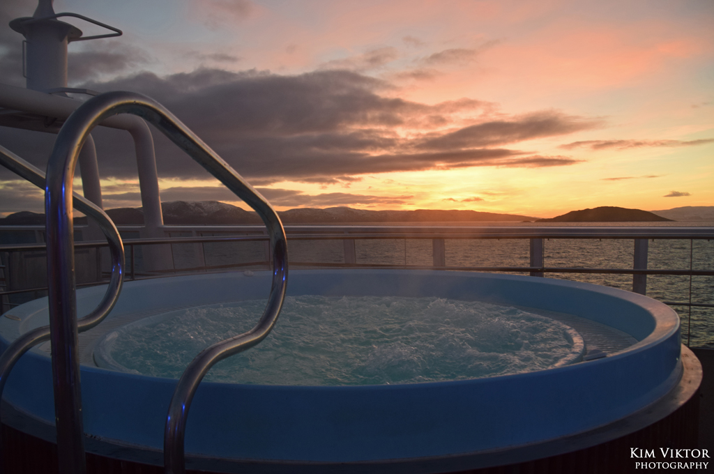 Nästa morgon tog jag ett välbehövligt dopp innan frukost. Svårt att slita sig från bubbelpoolen och stå halvnaken på däck med en piskande vind mot sig.