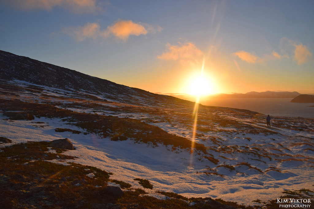 Solen försvinner bakom Middagstinden (1103 m.ö.h.).