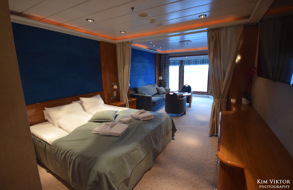 En titt in i en av Trollfjords sviter som höll på att städas. Jag skulle kunna tänka mig att bo här i 11 dagar.