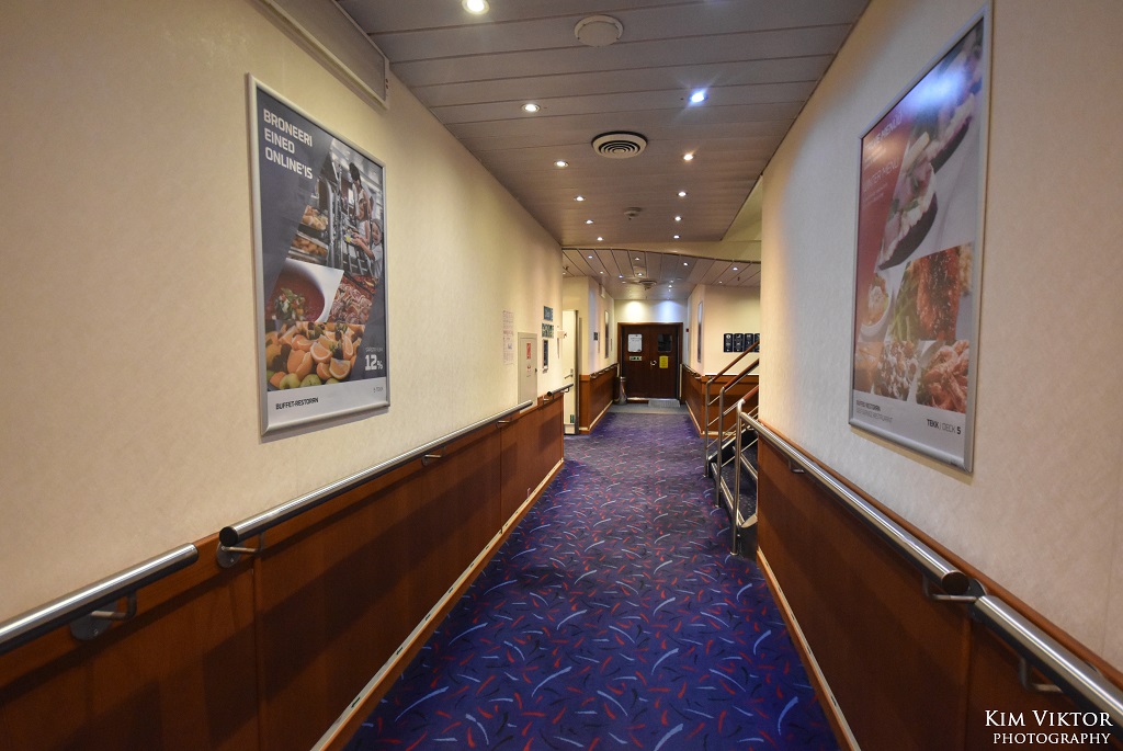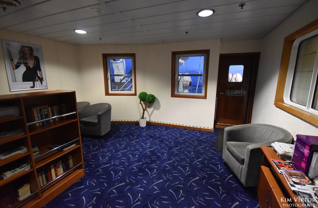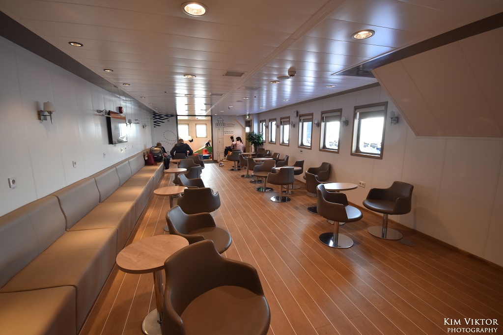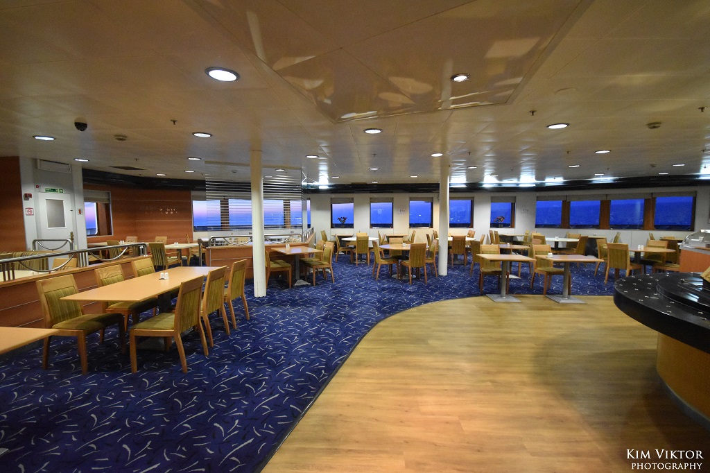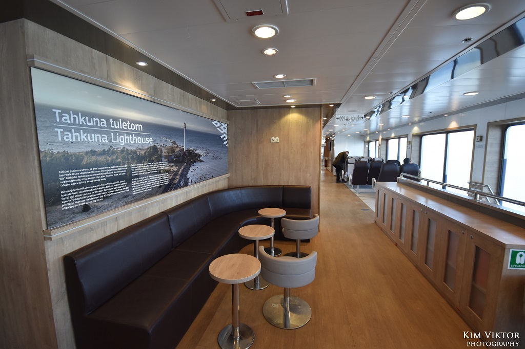 Eftersom vi hade en rullstolsburen resenär med oss fick vi en perfekt plats rätt så nära hiss. Besättningen var överlag mycket trevliga och serviceinriktade, stor skillnad om man jämför med Estlandsfärjorna för bara 15 år sedan. Alla talade också mycket bra engelska, utöver ryska (som verkar huvudspråket ombord) och estniska (endast servicepersonalen, övriga är från Litauen).
