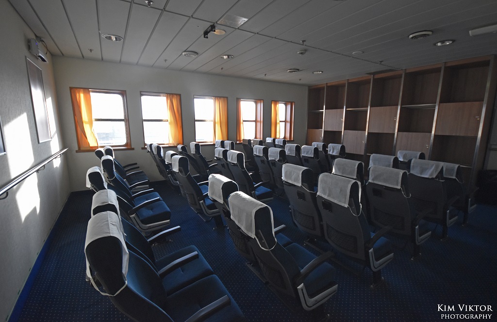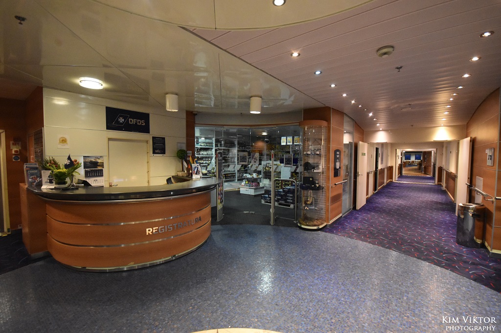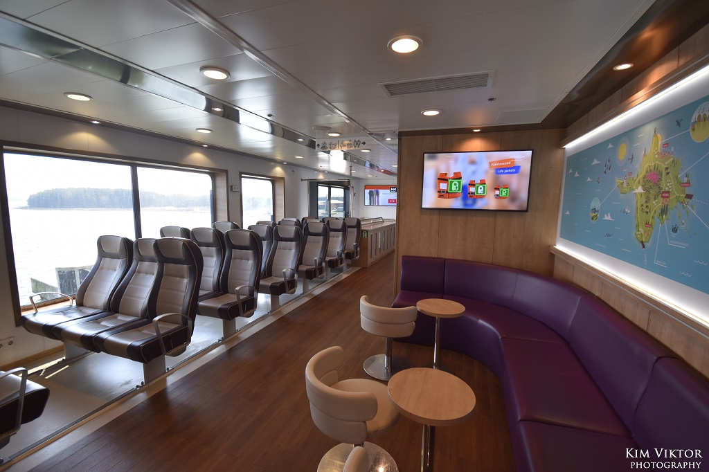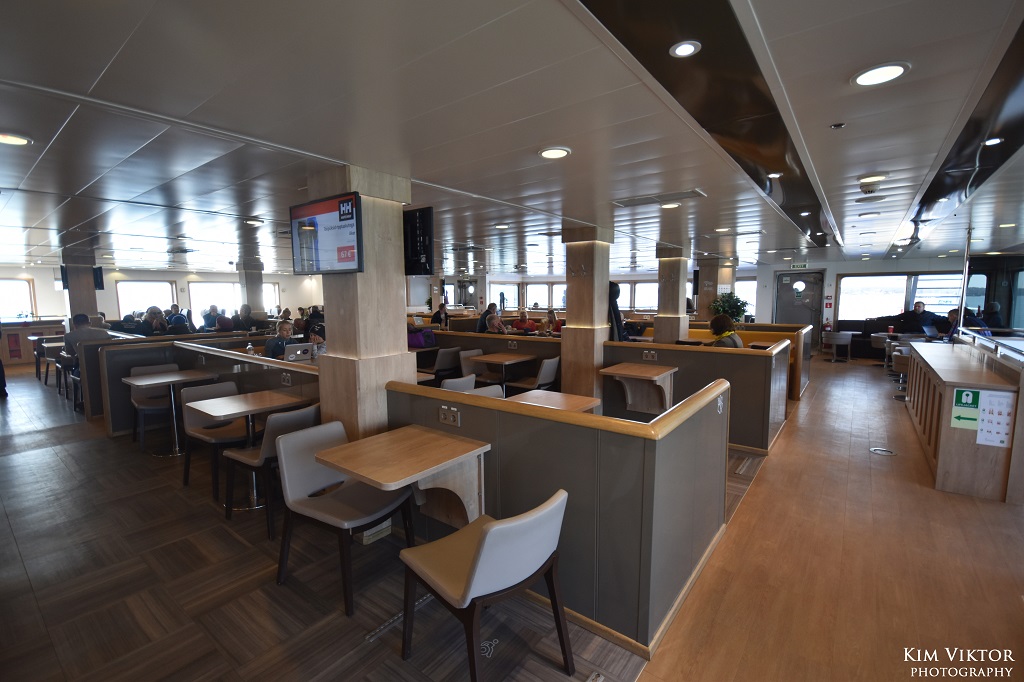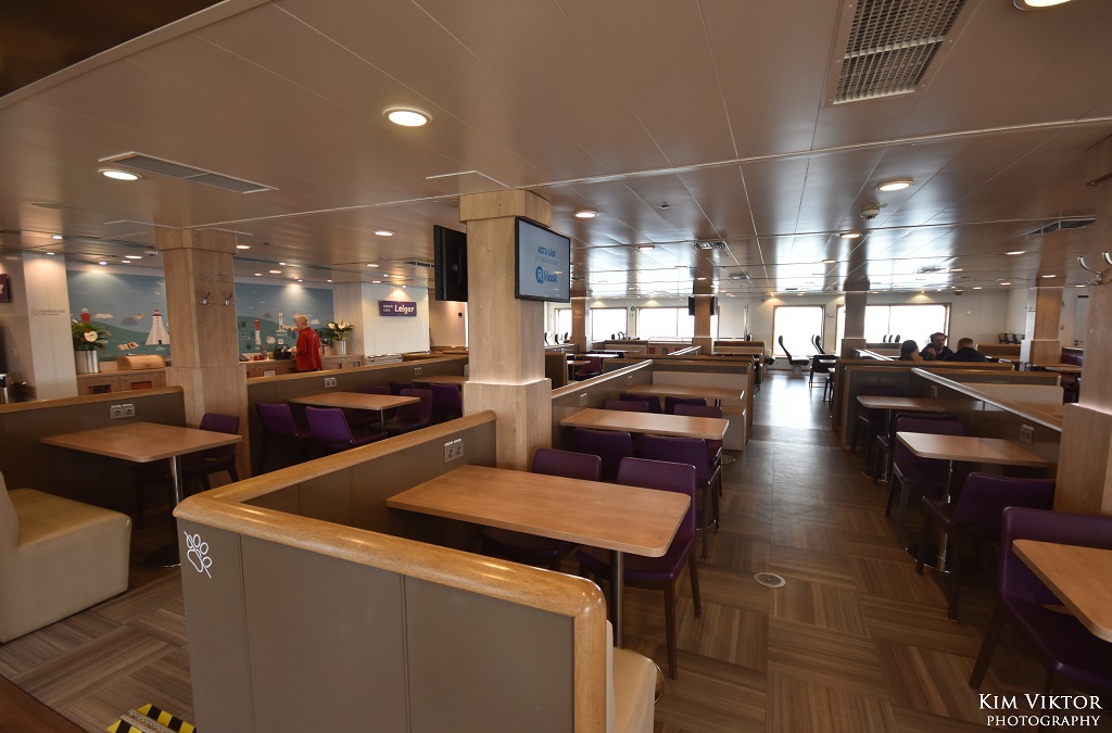Eftersom vi hade en rullstolsburen resenär med oss fick vi en perfekt plats rätt så nära hiss. Besättningen var överlag mycket trevliga och serviceinriktade, stor skillnad om man jämför med Estlandsfärjorna för bara 15 år sedan. Alla talade också mycket bra engelska, utöver ryska (som verkar huvudspråket ombord) och estniska (endast servicepersonalen, övriga är från Litauen).