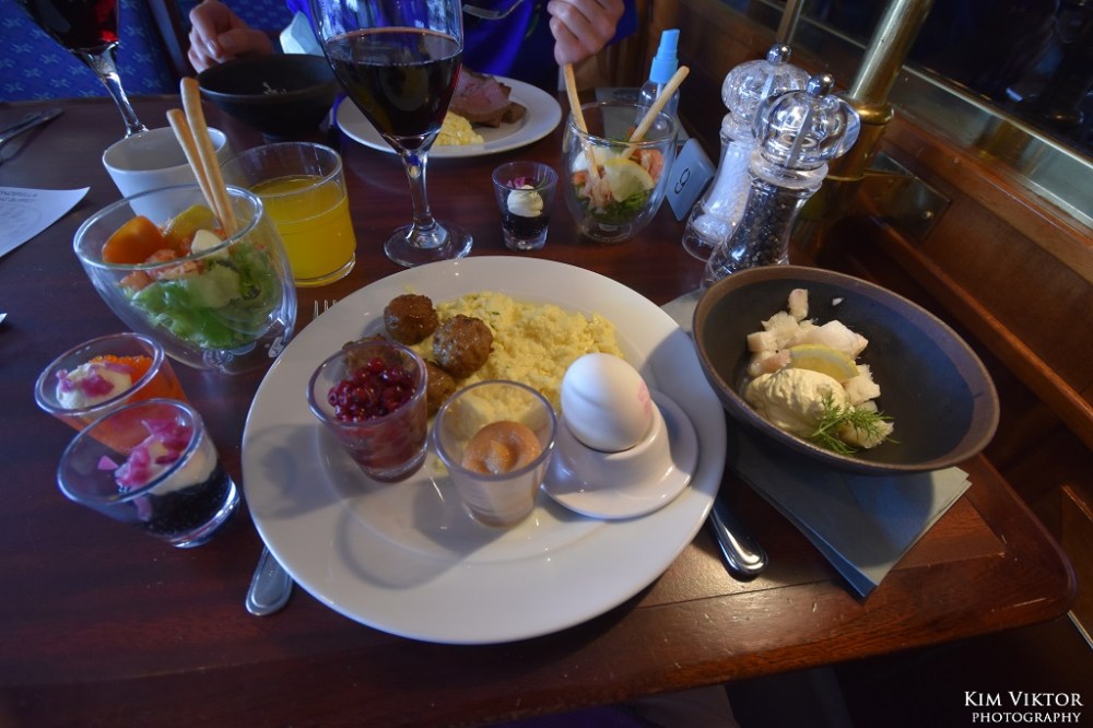 Brunchen serverades i buffén. Det var en salig blandning av det mesta, även vin ingick. Jag stör mig på att de ska sätta flera sällskap vid samma bord när restaurangen endast är halvfull.