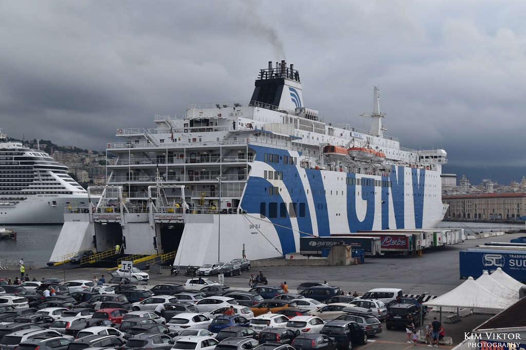 En hel del bilar skulle med på morgonavgången tillbaka till Sardinien. GNV Blu trafikerar rutten tillsammans med GNV Allegra (f.d. Color Lines Kronprins Harald). Normalt kör de bara kvällar från varsin hamn, men under lördagar i högsäsong kör de även en dagstur på 13 timmar.