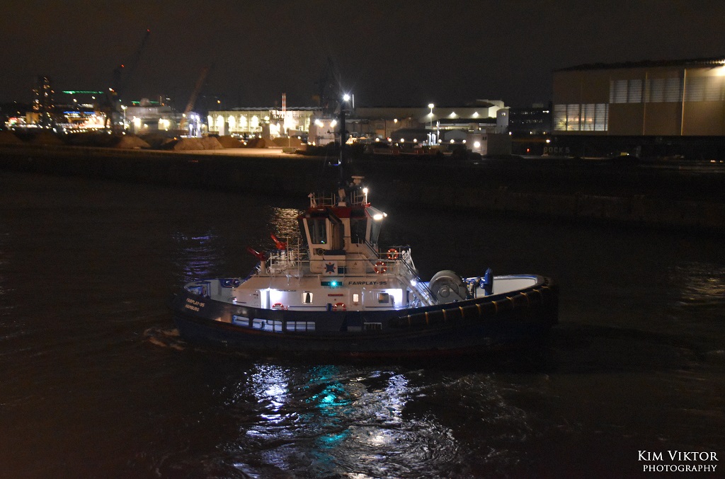 Bogseraren Fairplay-95 hjälpte oss ut från hamnen.