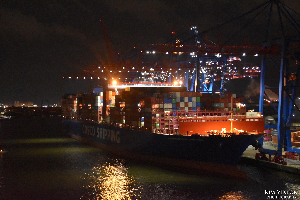 En av COSCOs bjässar som tar 20 000 containrar (TEU) lastar inför en resa till Kina.