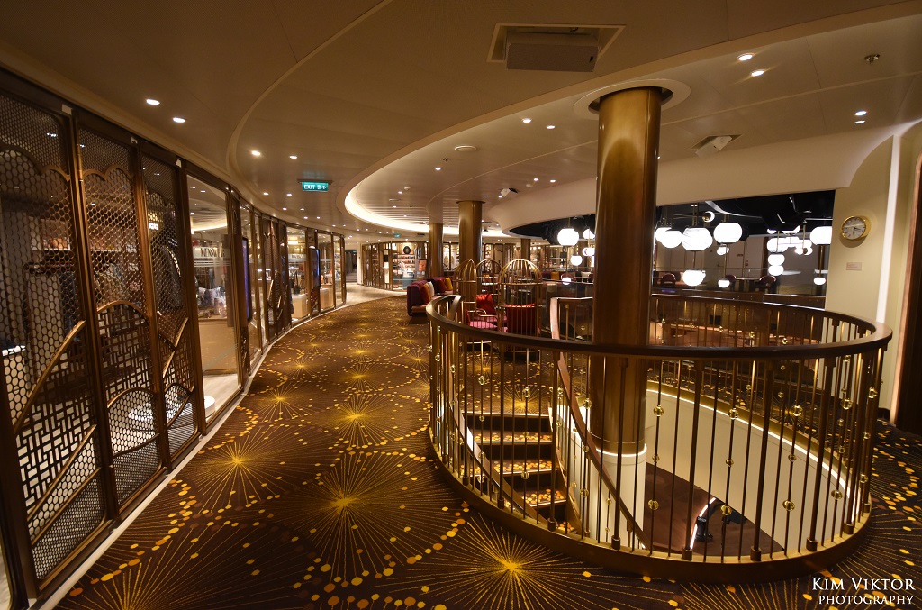 Queen’s room är fartygets underhållningshjärta, man kan ta del av underhållningen från ovan på däck 3.