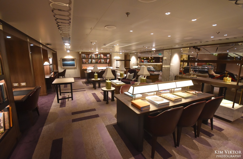 Intill Commodore Club hittar vi biblioteket, som är betydligt mycket mindre än på de andra Cunardfartygen, men jag gillade ändå utrymmet med sina varma färger.