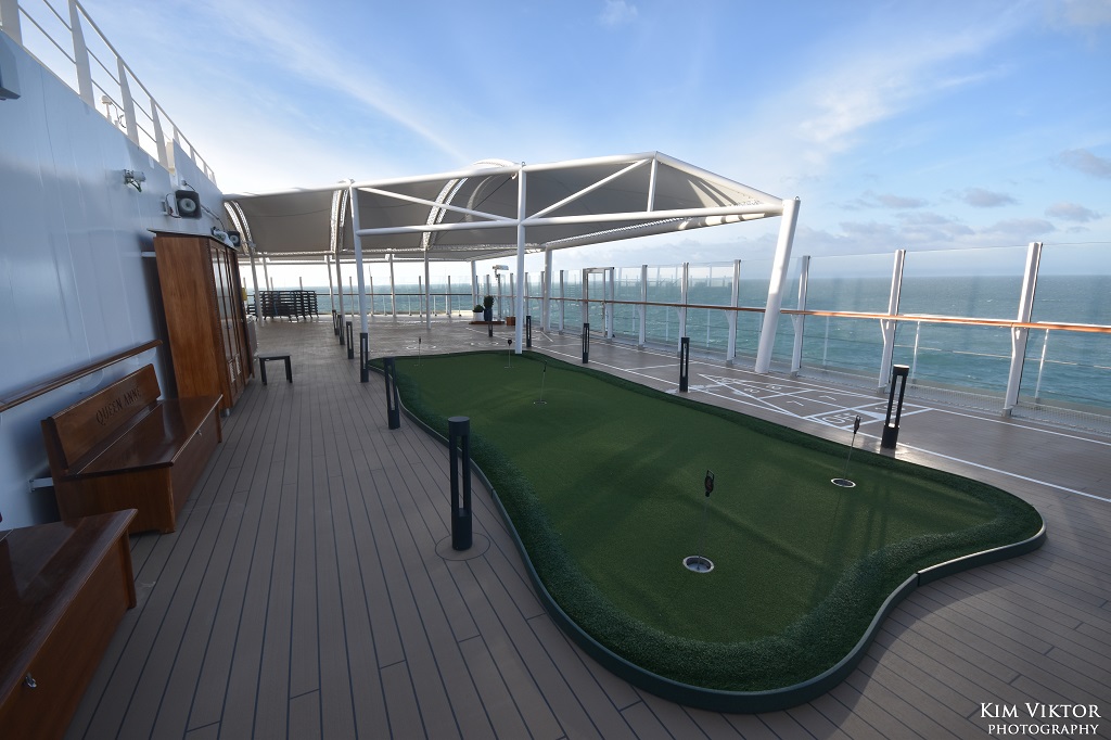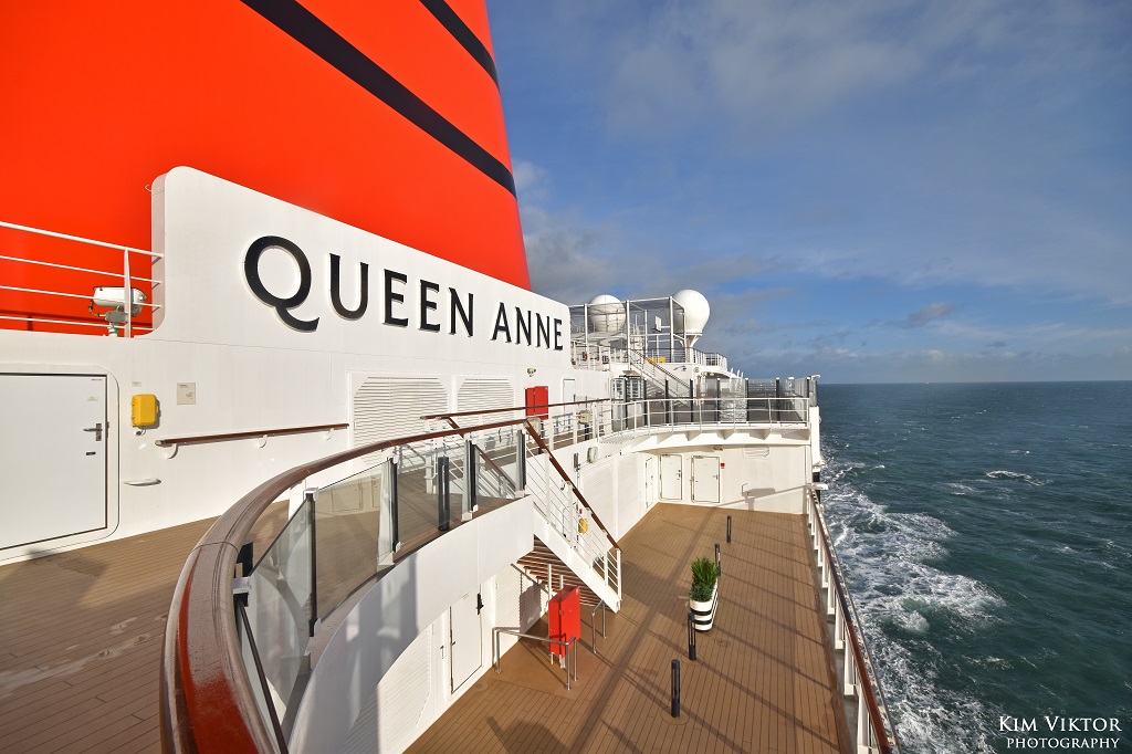 Queen Anne har ett promenaddäck som går runt hela fartyget, men tyvärr så är utsikten för det mesta skymd av livbåtar.