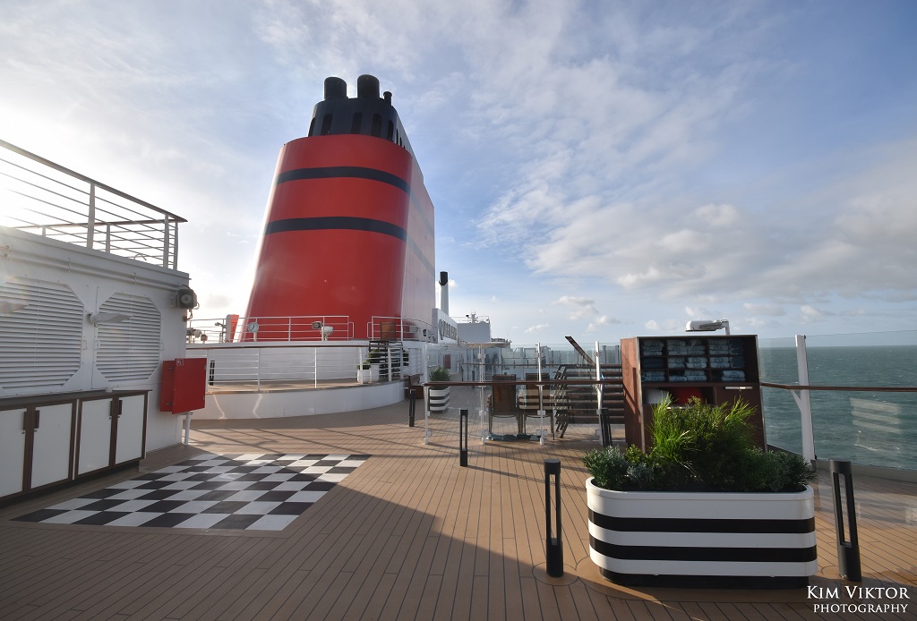 På hennes halvsystrar i Holland America Line är denna del av soldäcket avstängt för besättningen, men här fick man gå fritt eller ja fram till ”Grills soldäck” frmaför skorstenen. Så det är alltså inte möjligt att gå från för till akter.