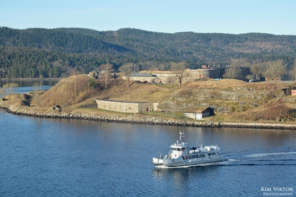 Färjan Oscarborg III kör till fästningen med samma namn.