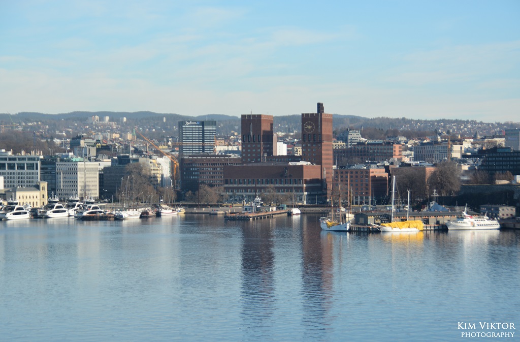 Oslos rådhus, till höger i bild syns fartyget Nobel, som tidigare gick som Lasse Dahlquist i Göteborgs skärgård.