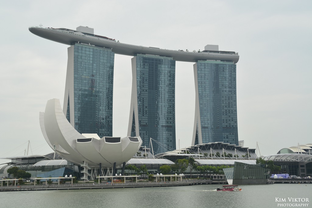 Marina Bay Sands är Singapores absolut kändaste landmärke. Den 57 våningar höga byggnader, innehåller allt från hotell till restauranger och världens största takpool. Byggnaden nere till vänster är ett konstmuseum.