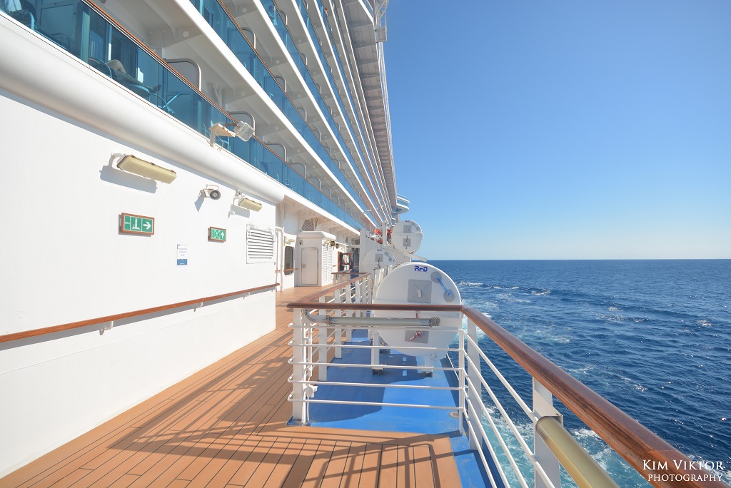 Royal Princess har tyvärr inget promenaddäck som går runt hela fartyget på däck 7. Dock har de en liten bit soldäck i aktern och även midskepps, vilka är rätt så bra att använda när man vill sola då det inte är så många som hittar hit.