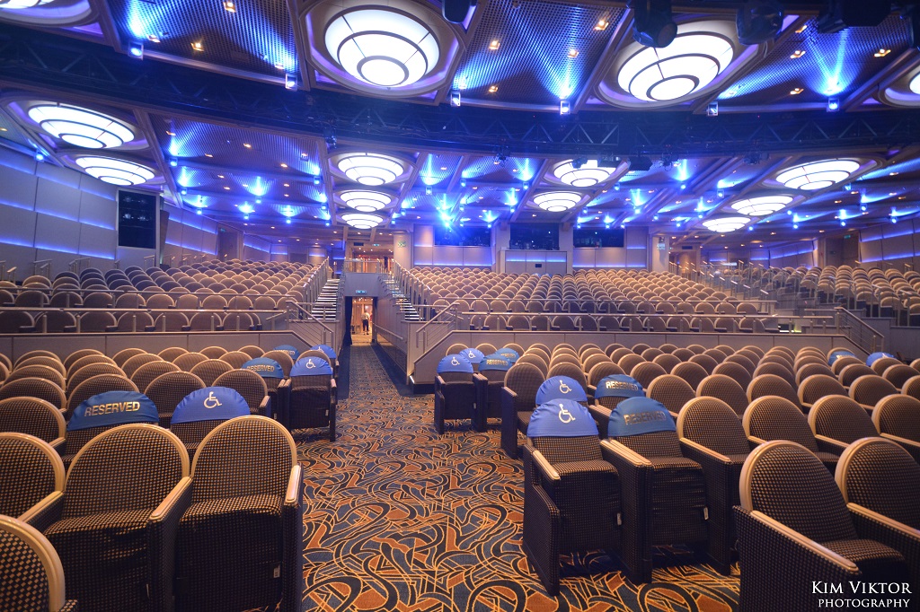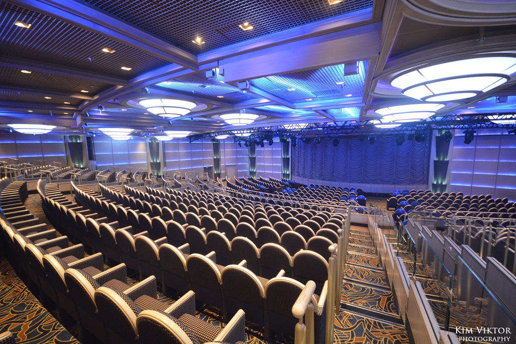Vi börjar i fören med den imponerande teatern. Varje kväll var det två föreställningar, en klockan 19.30 och en 21.30. Underhållningen varier varje kväll, men allt från musik- och dansshower till magiker och komiker. Det var aldrig något problem att få plats. Under produktionsshowerna så är vissa platser reserverade för de som har köpt ”Princess premier”, ett paket där bl.a. dryck och wifi ingår.