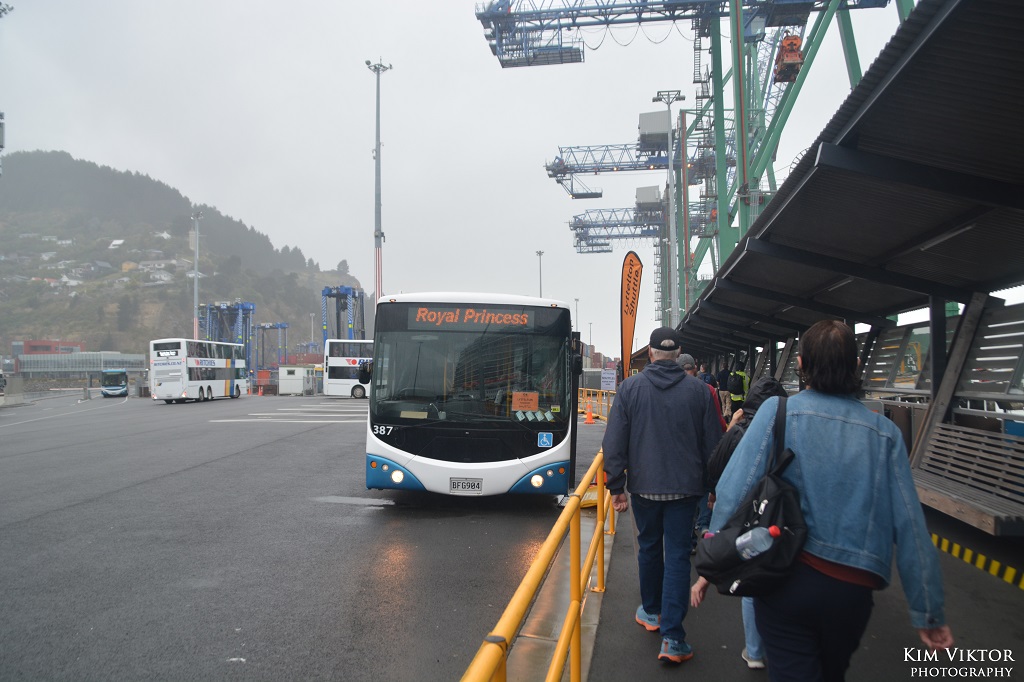 Eftersom även Lyttleton är en industrihamn så måste man åka buss från fartyget. Det fanns två olika alternativ antingen Princess skyttelbuss in till själva Christchurch som kostade 25 dollar tur och retur eller så kunde man välja transferbussen som tog oss in till ”centrala” Lyttleton. Denna var gratis, men eftersom det endast fanns en buss var man tvungen att hämta en ”biljett” och vänta på att ens nummer skulle ropas upp innan man gick iland.