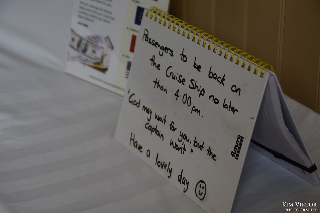 Lokalbussen till hamnen kostade bara 3 NZD (man var dock tvungen att betala med kontanter). Rederiet erbjöd även en transferbuss som kostade 30 AUD tur och retur.