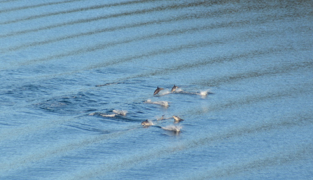 Ett helt stim med delfiner hoppade längs med fartyget.