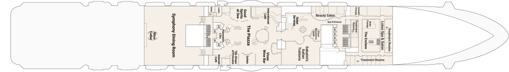 Ombord finns det tre huvudrestauranger med olika koncept. Dels har vi här Concerto dining room, som erbjuder ”walk in” middag, man behöver alltså inte reservera något i förväg utan det är bara att komma hit. Restaurangen används även för svitgäster som kan äta frukost och lunch här.