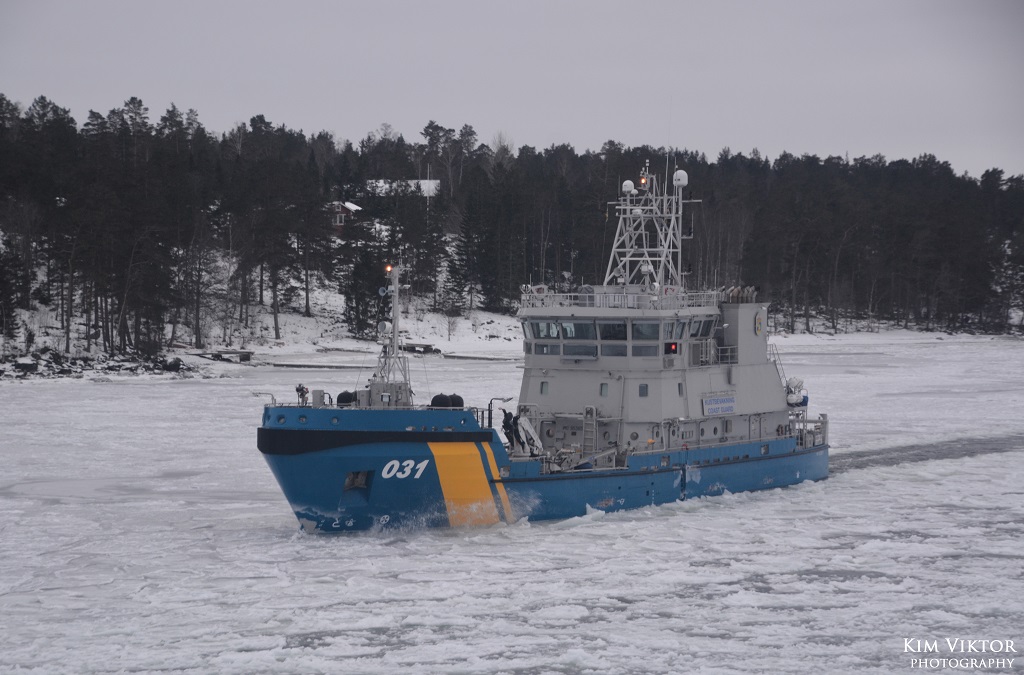 Kustbevakningen på väg norrut genom Furusundsleden.