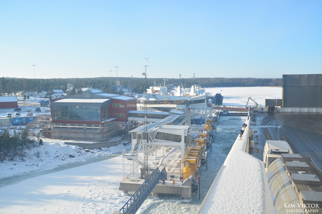 Lite lustigt att de lyckas bygga en landgång som passar till Finnlines färjor, men inte i Kapellskär. Inne i landgången finns också fortfarande skyltar för Galaxy kvar. Till vänster syns den nya stora terminalen de håller på att bygga för att underlätta för dagskryssarna.