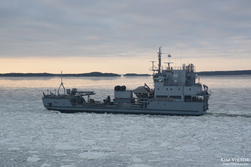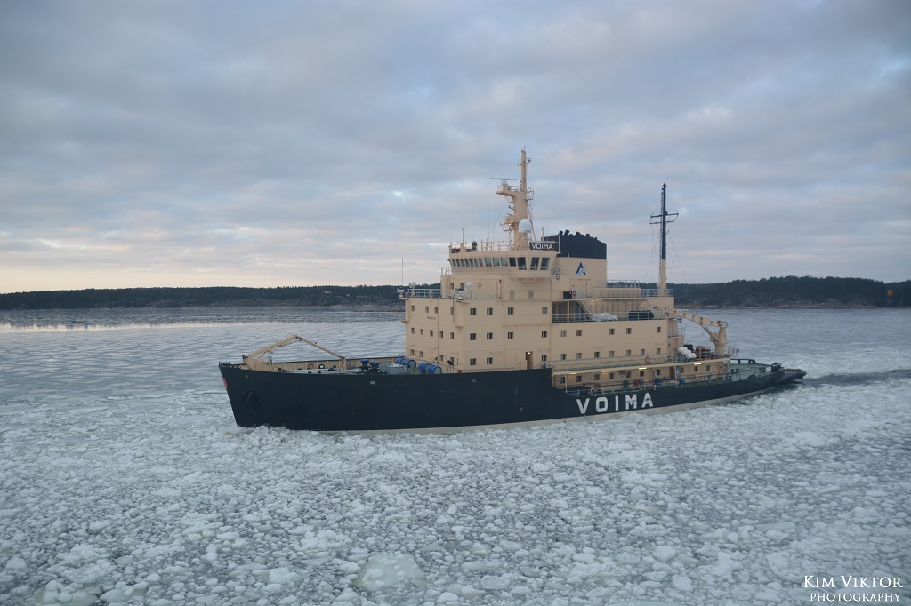 Den äldsta finska isbrytaren Voima (1954) höll farlederna mellan Utö och Nystad öppna under vintern .